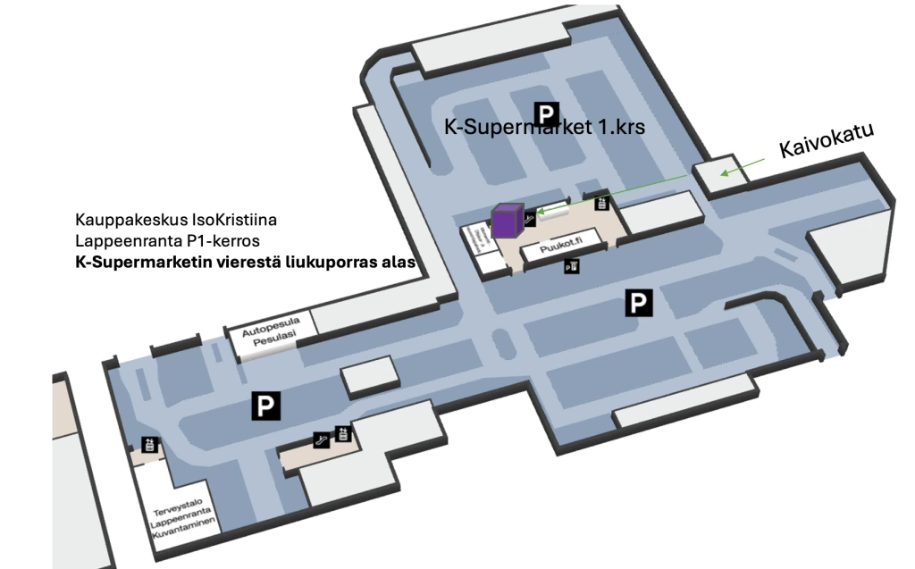 P1.kerros, K-Supermarketin vieressä rullaportaiden alapäässä.